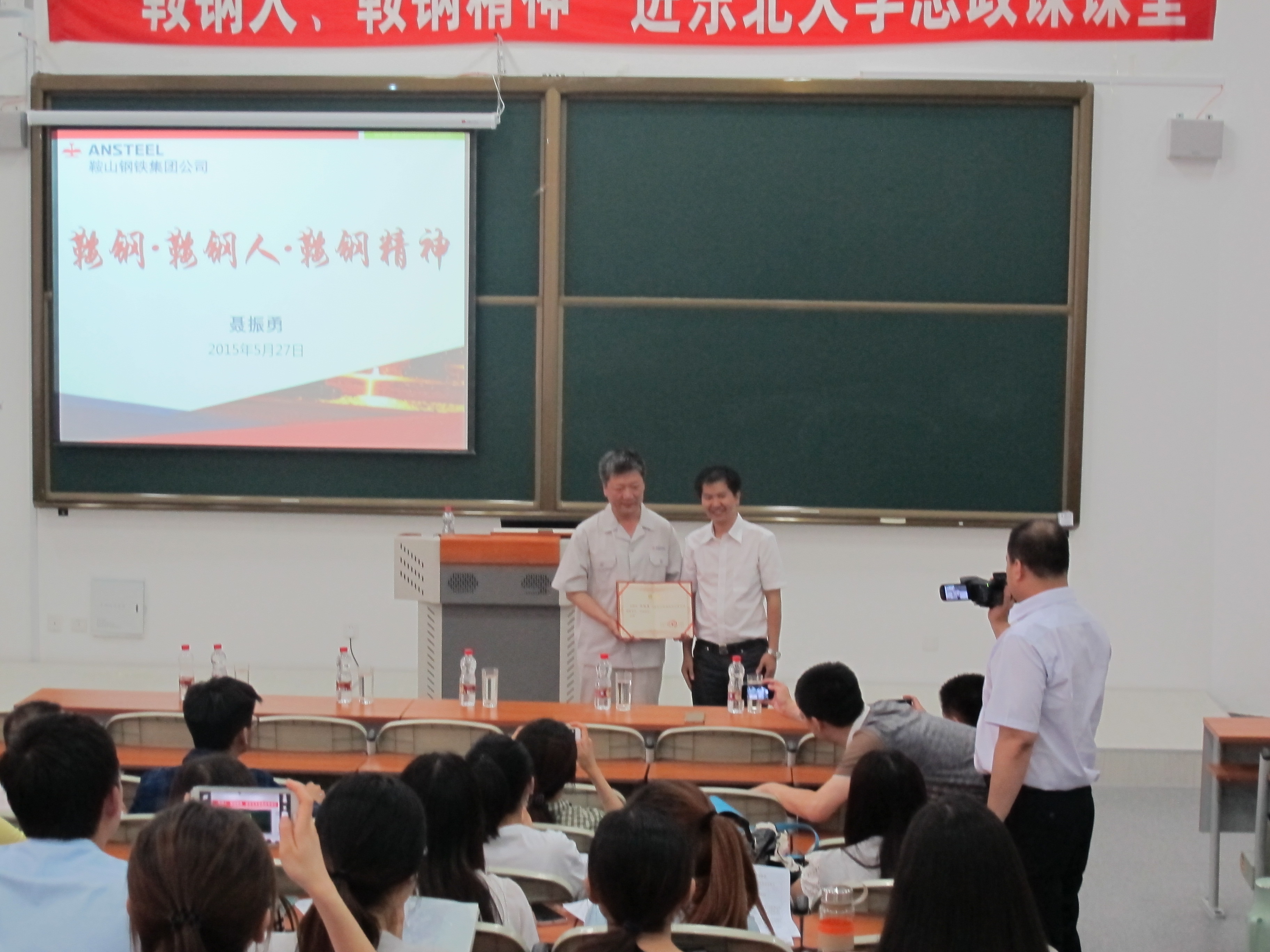 思政课特聘教授聘任仪式。首位特聘教授鞍山钢铁集团公司党委宣传部、二八杠部部长聂振勇,鞍钢集团公司代表、郭明义爱心团队代表,以及二八杠