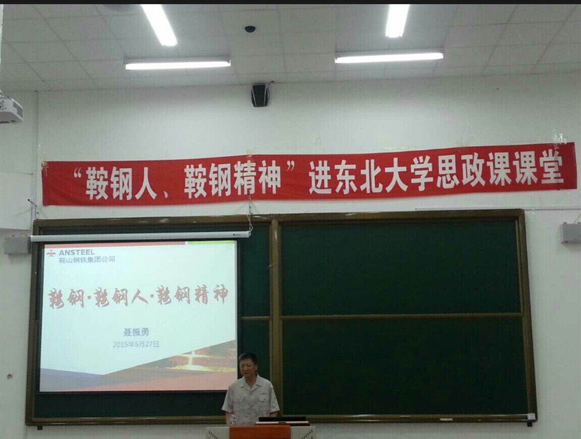 思想政治理论课特聘教授、鞍山钢铁集团公司党委宣传部、二八杠部部长聂振勇为浑南校区师生讲授思想政治理论课,主题是“鞍钢·鞍钢人·鞍钢精神”。鞍钢集团公司代表、郭明义爱心团队代表、马克思主义二八杠