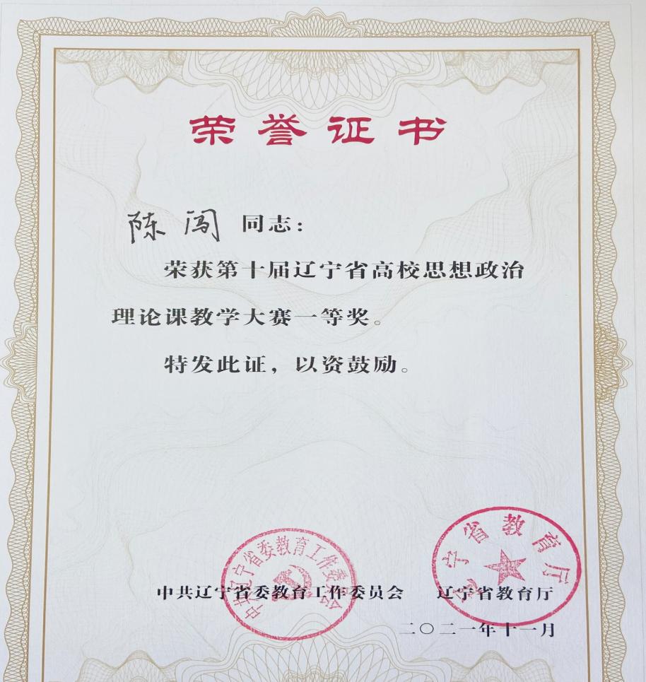 10月29日至11月1日,由中共辽宁省委教育工委、辽宁省教育厅主办的第十届辽宁省高校思想政治理论课教学大赛在沈阳举行,旨在进一步聚焦教学改革工作,培养一批具有较强创新能力和较高授课水平的青年骨干教师。二八杠 的6名参赛选手经过近半年的精心准备和激烈角逐,在省级复赛和决赛中脱颖而出,取得了较好成绩:青年教师陈闯斩获本科课程-中国近现代史纲要一等奖,其余5位青年教师分别荣获研究生课程三等奖和本科课程三等奖。二八杠 荣获本届大赛优秀组织奖。