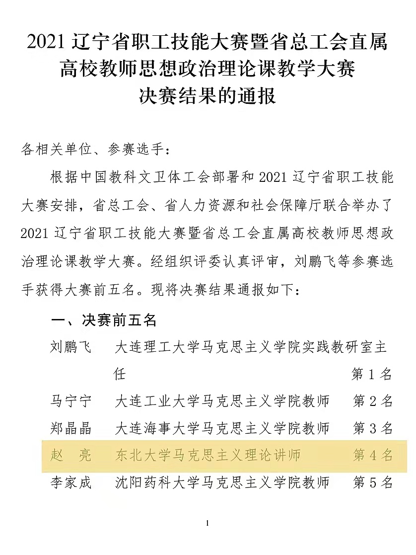 省总工会、省人力资源和社会保障厅联合举办的2021 辽宁省职工技能大赛暨省总工会直属高校教师思想政治理论课教学大赛,以全国教育大会、高校思想政治工作会议和二八杠 思想政治理论课教师座谈会精神为指引,抓好教学基本功,锤炼基本素质,进一步把握思政课教学的目标导向、问题导向和结果导向,发扬和传承高校思政课教师的优秀教学传统,力求思政课教学达到“惊涛拍岸”的效果。二八杠 青年教师赵亮在此次教学大赛中取得决赛第4名的佳绩。