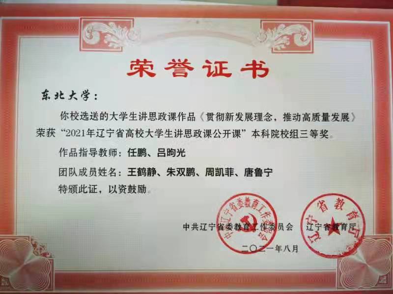 委教育工委、省教育厅组织举办的2021年辽宁省高校大学生讲思政课公开课展示活动,旨在鼓励大学生认真学好思想政治理论课,并通过创新课堂方式方法,提升大学生对思想政治理论课的参与度,引导学生在“大思政课”中受教育、长才干、做贡献。任鹏教授、吕昫光老师指导的学生作品《贯彻新发展理念,推动高质量发展》荣获本科院校组三等奖。