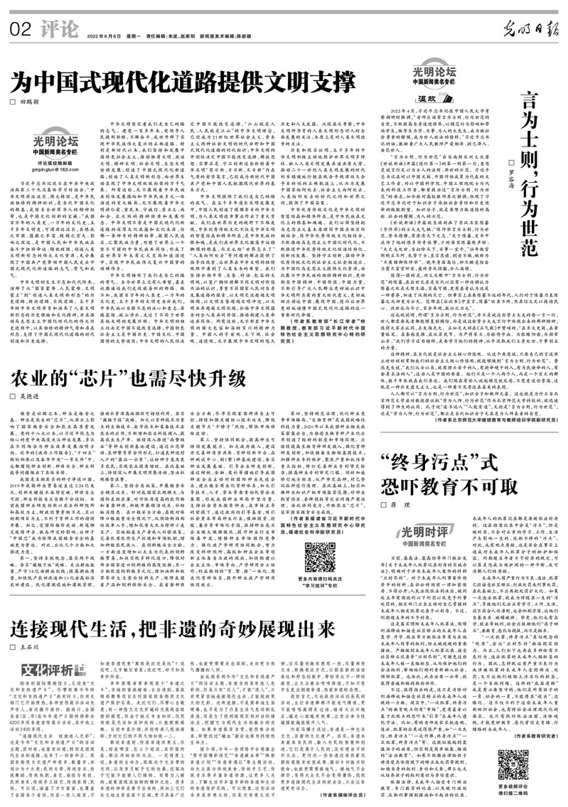 中华文明锤炼了我们走自己的路的骨气。当今世界上总有人希望,甚至试图逼迫我们走改旗易帜的邪路。殊不知,我国百万年的人类史、一万年的文化史、五千多年的文明史告诉我们,中华民族以自强不息的决心和意志,筚路蓝缕、跋山涉水,走过了不同于世界其他文明的发展历程。中华文明的独立性决定中国不能改变选择,中国特色社会主义是中国历史、中国文化、中国国情的大势使然;中华文明的人民性决定中国不能改变选择,“江山就是人民、人民就是江山”的中华文明理念,已经成为21世纪世界社会主义、资本主义两种社会文明的时代分野和中国式现代化道路的时代标识;中华文明的开创性决定中国不能改变选择,解放思想、实事求是、守正创新这些折射着中华文明“苟日新、日日新、又日新”内在气质的哲学箴言,已经成为新时代中国共产党和中国人民把握现代世界的基本方式。