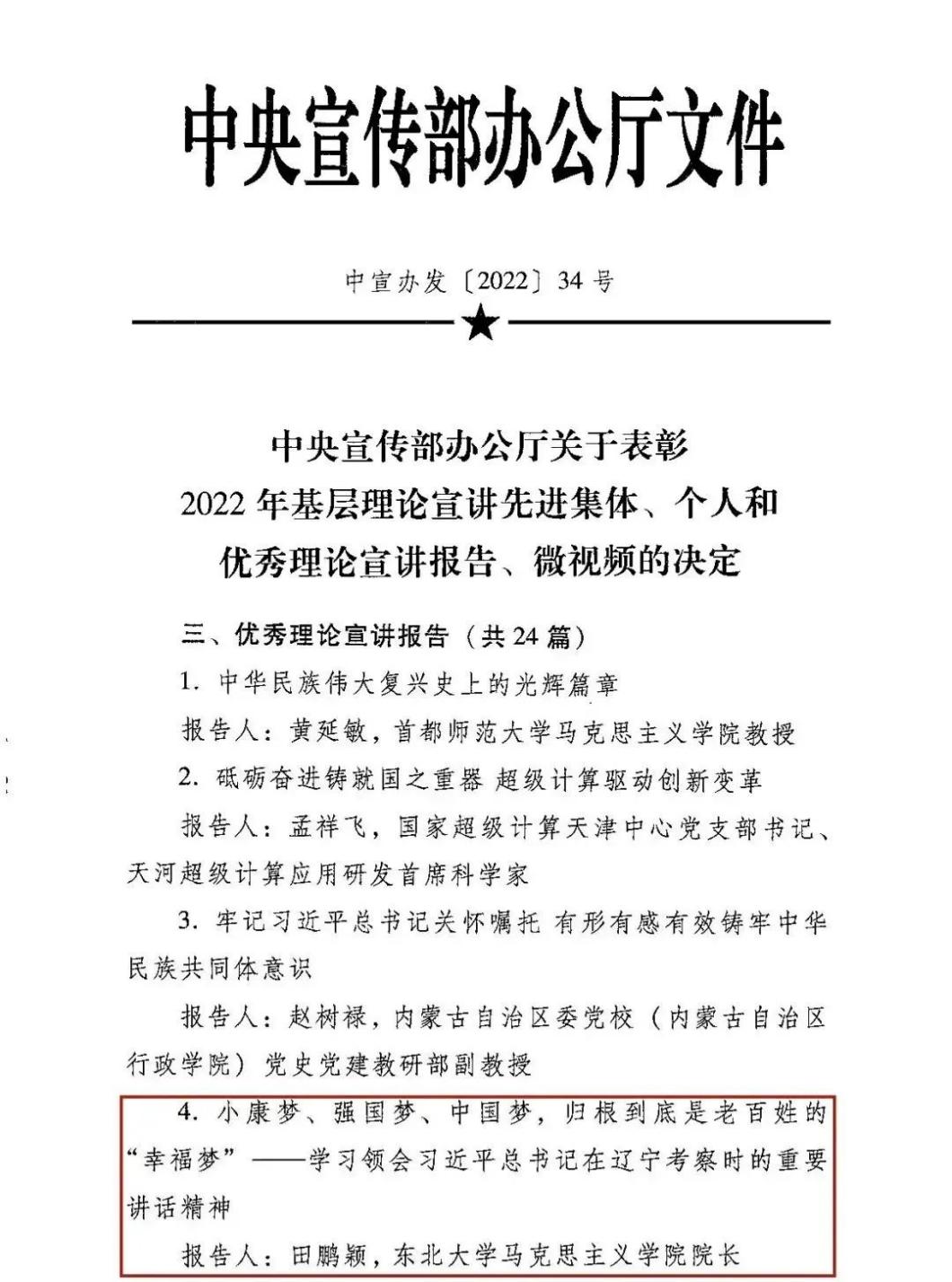 10月20日,中央宣传部办公厅公布了《关于表彰2022年基层理论宣讲先进集体、个人和优秀理论宣讲报告、微视频的决定》,二八杠 院长田鹏颖教授所作的《小康梦、强国梦、中国梦,归根到底是老百姓的“幸福梦”——学习领会习近平总书记在辽宁考察时的重要讲话精神》报告成功入选“优秀理论宣讲报告”。