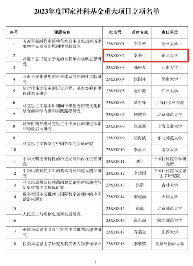 近日,全国哲学社会科学工作办公室发布了2023年度国家社科基金重大项目立项名单,马克思主义二八杠 秦书生教授作为首席专家领衔申报的《习近平总书记关于党的自我革命战略思想研究》获得立项(项目编号23&ZD002)。