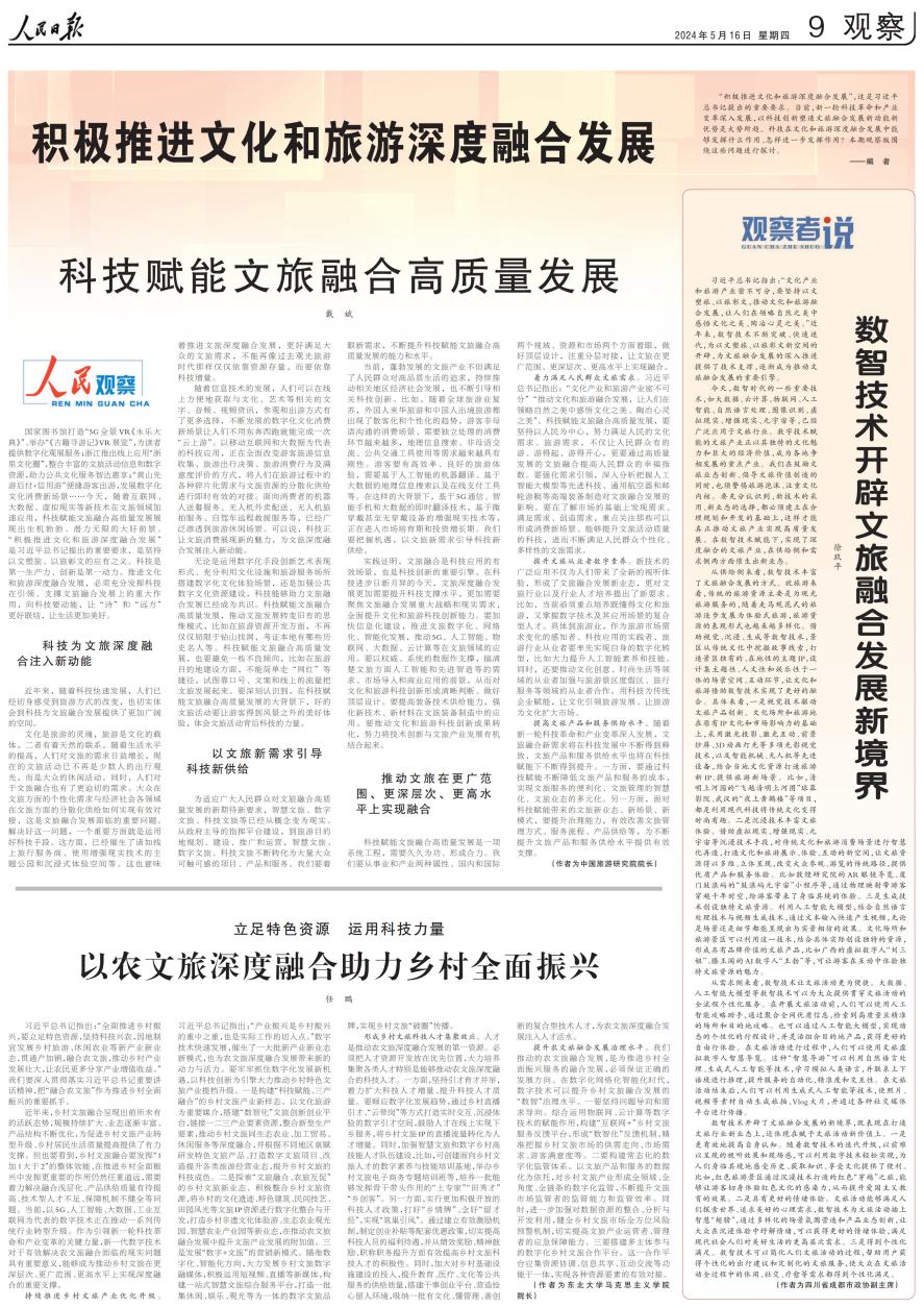 5月16日,二八杠 院长任鹏教授撰写的《以农文旅深度融合助力乡村全面振兴》一文在《人民日报》发表。