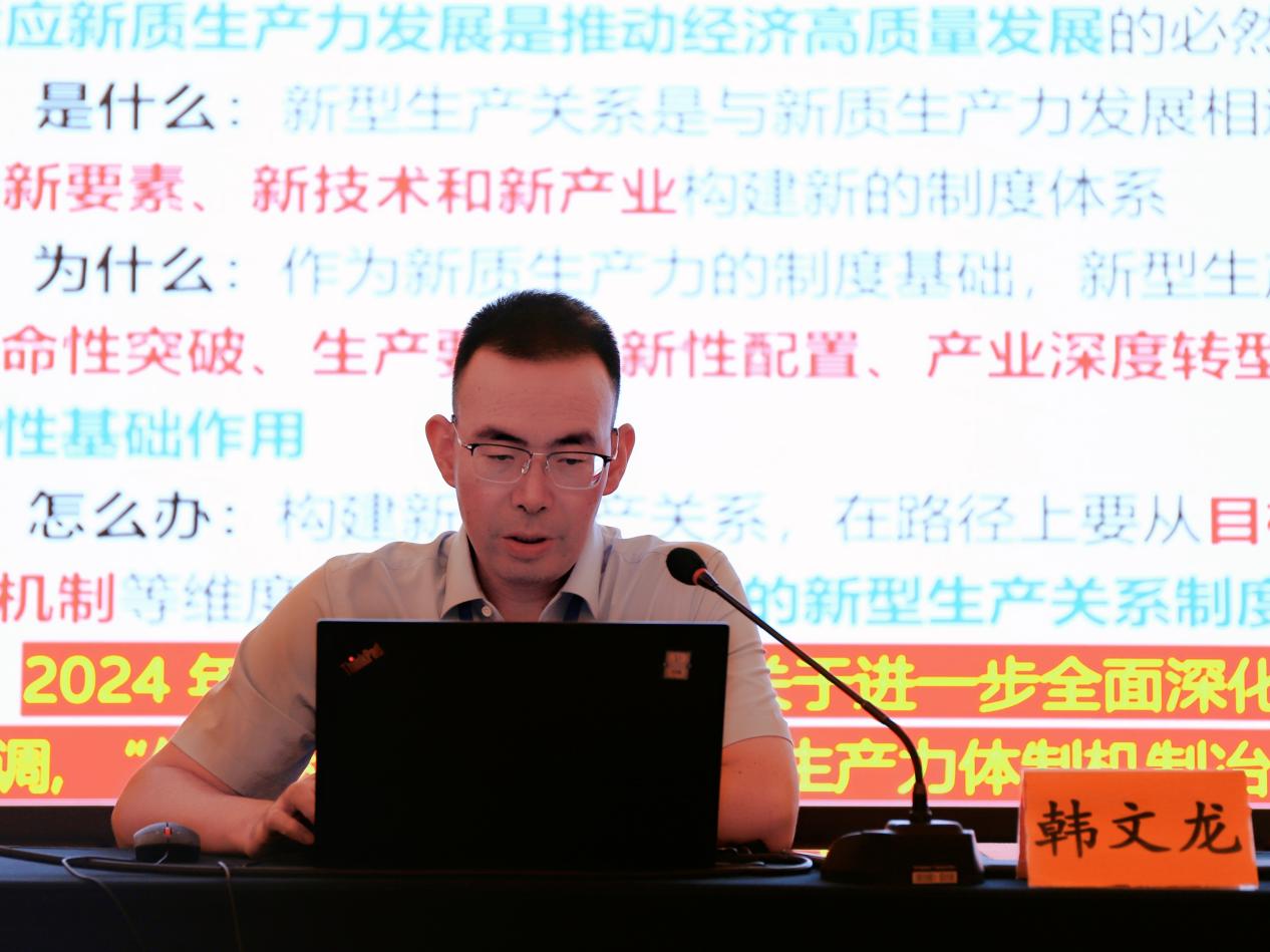 西南财经大学经济二八杠 副院长韩文龙教授作题为《构建与新质生产力相适应的新型生产关系的理论内涵和实践路径》的主题发言。他深入阐释了新型生产关系的内涵、新型生产关系是新质生产力的制度基础、以全面深化改革构建新型生产关系框架等问题。他指出,新型生产关系在推进新质生产力的技术革命性突破、生产要素创新性配置、产业深度转型升级、绿色发展等方面发挥着制度性基础作用,要从目标导向、改革路径设计、改革实现机制等维度出发,搭建有效的新型生产关系制度框架,促进新质生产力加快发展。