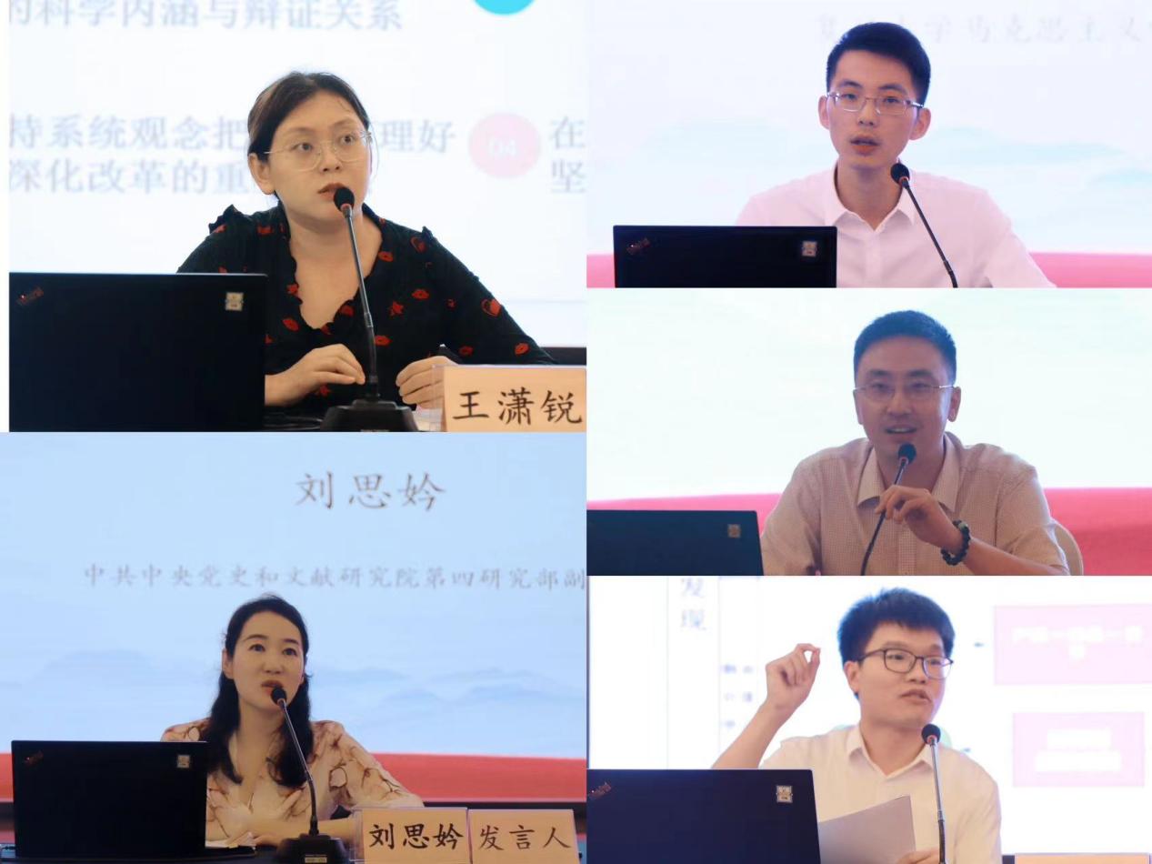 中共中央党史和文献研究院第四研究部王潇锐副研究员、中共中央党史和文献研究院第四研究部刘思妗副研究员、复旦大学马克思主义二八杠 包炜杰副教授、中国社会科二八杠 哲学研究所韩蒙副研究员、北京航空航天大学马克思主义二八杠 巩永丹副教授分别作题为“以坚持系统观念推进全面深化改革”“中国式现代化视域下的‘人民至上’价值理念探析”“‘高质量发展’的历史唯物主义阐释”“‘社会主义现代化’的唯物史观根据”“唯物史观视野下中国式现代化理论的逻辑架构”的发言。