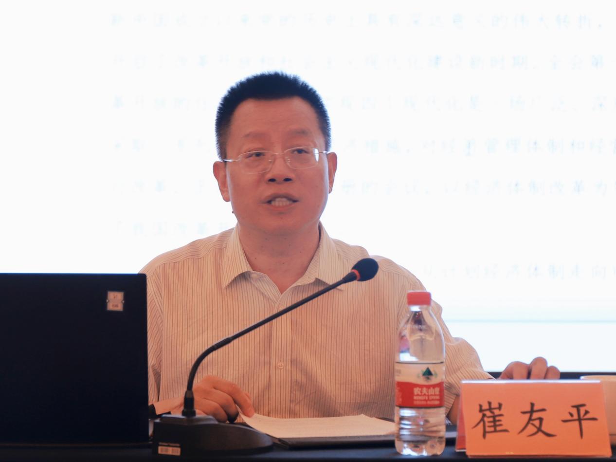 崔友平作题为《以经济体制改革为牵引进一步全面深化改革》的主旨报告。他从“以经济体制改革启动我国改革开放”“经济体制改革的主线——从计划经济体制走向市场经济体制”“以经济体制改革为重点推动全面深化改革”“以经济体制改革为牵引,进一步全面深化改革”等方面深入阐释。他表示,改革开放及其全面深化是以经济体制改革为启动、重点和牵引的,同时经济体制改革的不断深入,必将推动其他领域的改革,推动全面深化改革。他强调,《决定》既是党的十八届三中全会以来全面深化改革的实践续篇,又是新征程推进中国式现代化的时代新篇,也必将具有划时代意义。他指出,要注重发挥经济体制改革牵引作用,全面部署经济体制深化改革,并以经济体制改革为牵引,进一步全面深化改革。