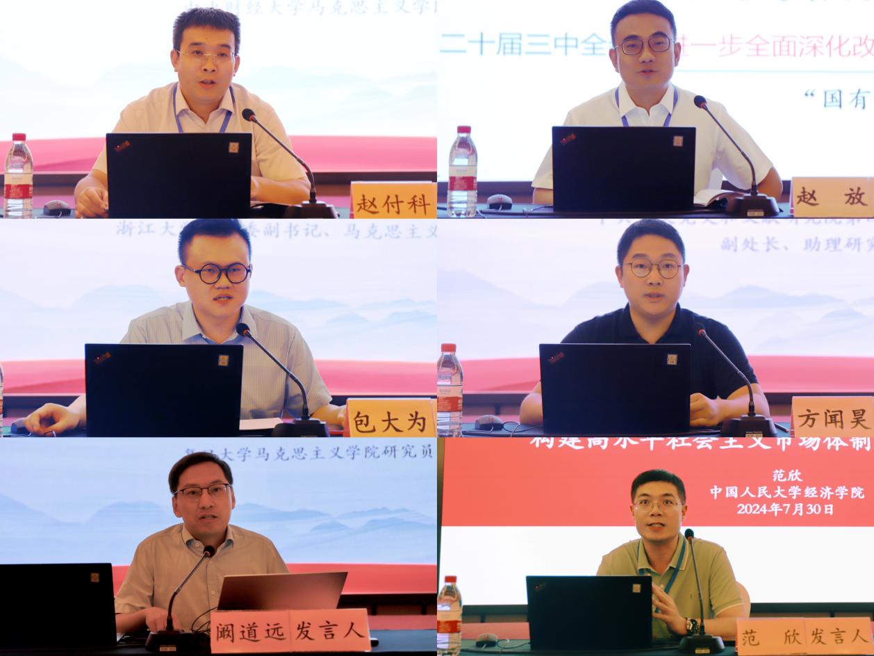 中央财经大学马克思主义二八杠 赵付科教授,吉林大学绿色金融与碳中和创新实验室常务副主任、吉林省文旅教育与文旅产业研究中心主任、吉林大学经济二八杠 赵放教授,浙江大二八杠 团委副书记、马克思主义二八杠 包大为研究员,中共中央党史和文献研究院第四研究部编辑一处副处长、方闻昊助理研究员,复旦大学马克思主义二八杠 阚道远研究员,中国人民大学全国中国特色社会主义政治经济学研究中心副主任范欣副教授分别作题为“进一步全面深化改革必须坚持正确的方法论”“中央企业引领发展新质生产力的核心要义与实践导向”“中国式现代化:世界百年未有之大变局的关键变量”“以新发展理念引领进一步全面深化改革”“党领导中国式现代化的基本逻辑”“要素市场化配置改革:构建高水平社会主义市场经济体制的重要抓手”的发言。