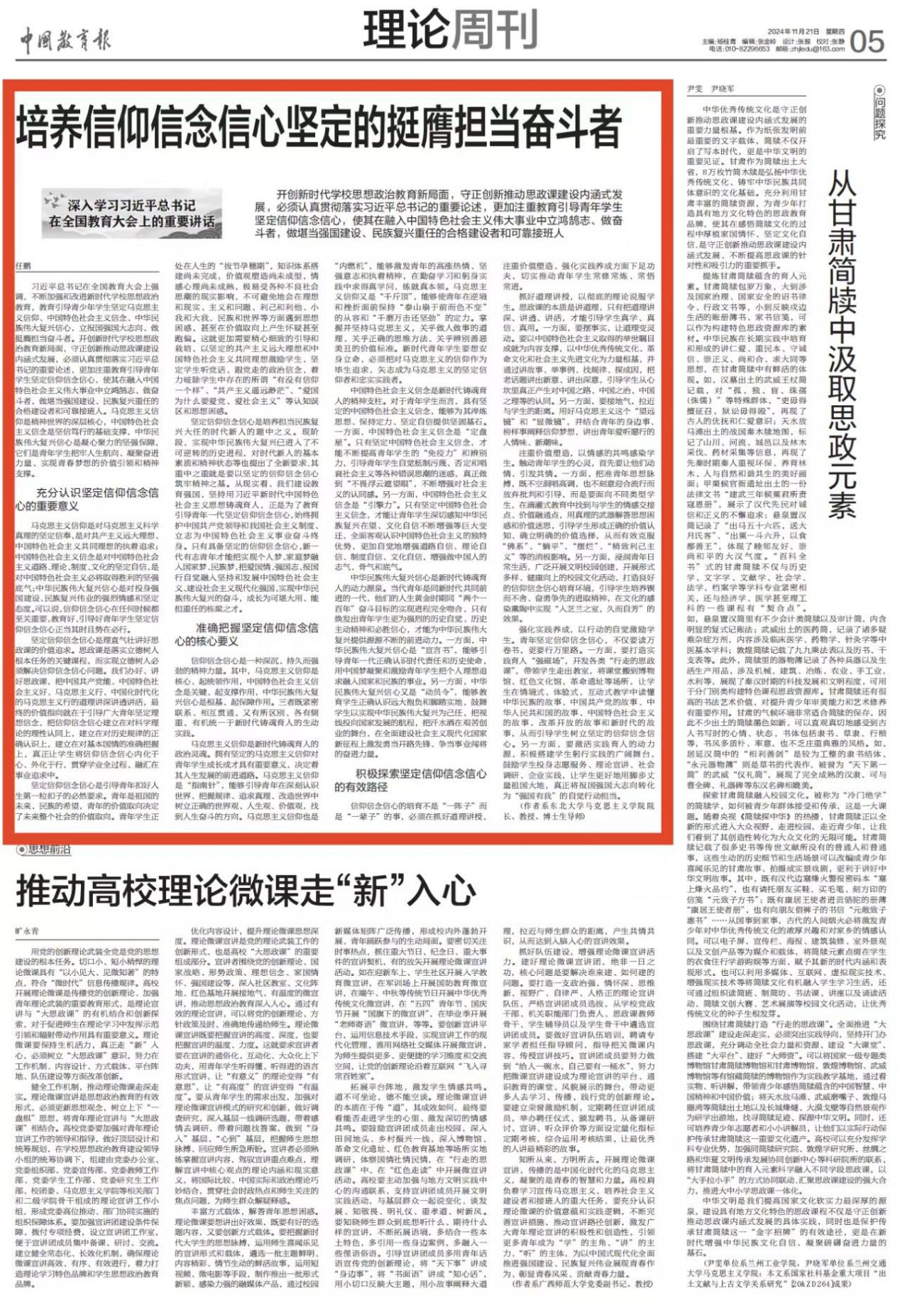 习近平总书记在全国教育大会上强调,不断加强和改进新时代二八杠 思想政治教育,教育引导青少年学生坚定马克思主义信仰、中国特色社会主义信念、中华民族伟大复兴信心,立报国强国大志向、做挺膺担当奋斗者。开创新时代二八杠 思想政治教育新局面,守正创新推动思政课建设内涵式发展,必须认真贯彻落实习近平总书记的重要论述,更加注重教育引导青年学生坚定信仰信念信心,使其在融入中国特色社会主义伟大事业中立鸿鹄志、做奋斗者,做堪当强国建设、民族复兴重任的合格建设者和可靠接班人。马克思主义信仰是精神世界的深层核心,中国特色社会主义信念是坚信笃行的基础支撑,中华民族伟大复兴信心是凝心聚力的坚强保障,它们是青年学生把牢人生航向、凝聚奋进力量、实现青春梦想的价值引领和精神支撑。