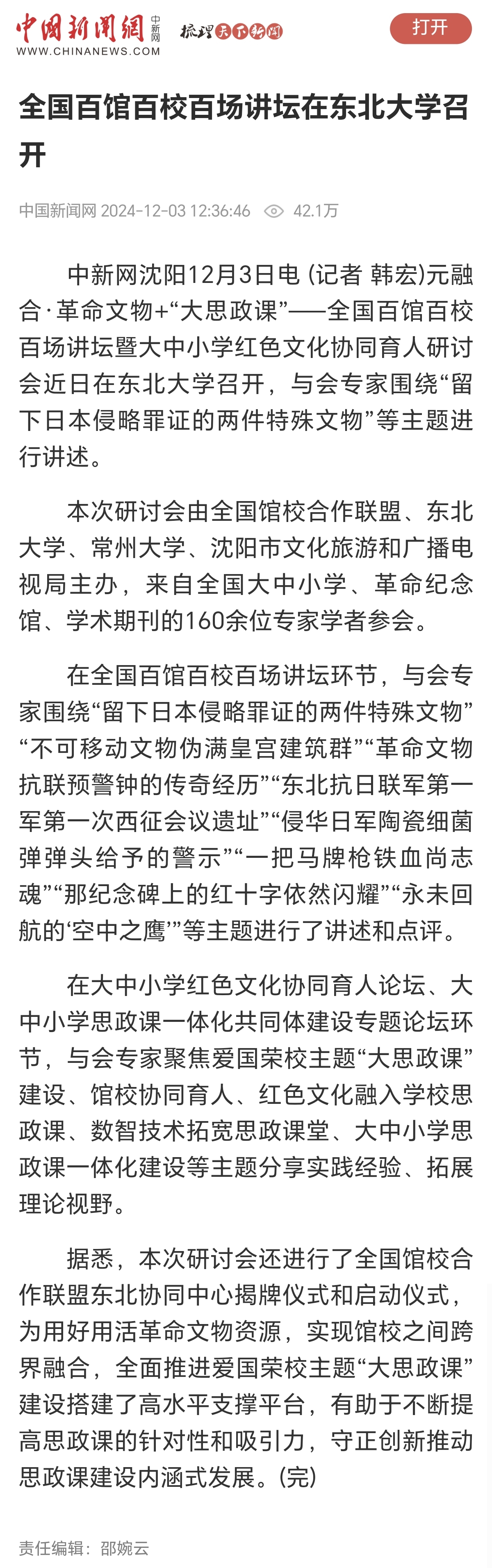 中新网沈阳12月3日电 元融合·革命文物+“大思政课”——全国百馆百校百场讲坛暨大中小学红色文化协同育人研讨会近日在二八杠 召开,与会专家围绕“留下日本侵略罪证的两件特殊文物”等主题进行讲述。
