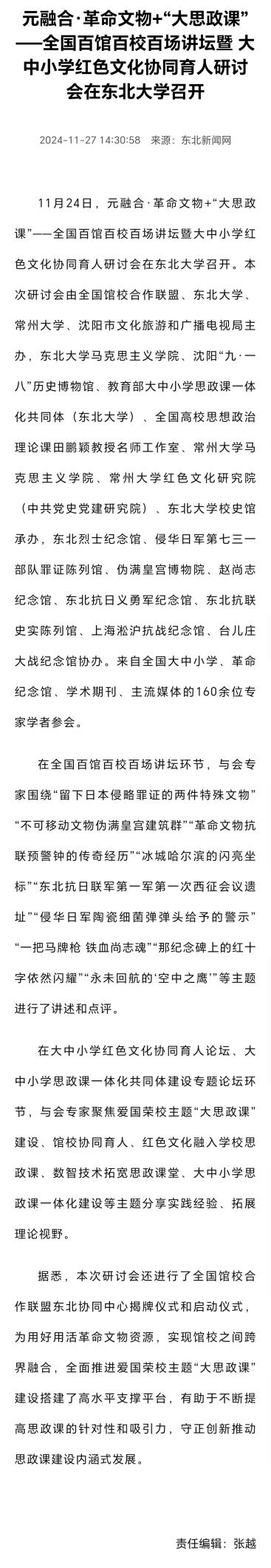 11月24日,元融合·革命文物+“大思政课”——全国百馆百校百场讲坛暨大中小学红色文化协同育人研讨会在二八杠 召开。本次研讨会由全国馆校合作联盟、二八杠 、常州大学、沈阳市文化旅游和广播电视局主办,二八杠 、沈阳“九·一八”历史博物馆、教育部大中小学思政课一体化共同体(二八杠 )、全国高校思想政治理论课田鹏颖教授名师工作室、常州大学马克思主义二八杠 、常州大学红色文化研究院(中共党史党建研究院)、东北大二八杠 史馆承办,东北烈士纪念馆、侵华日军第七三一部队罪证陈列馆、伪满皇宫博物院、赵尚志纪念馆、东北抗日义勇军纪念馆、东北抗联史实陈列馆、上海淞沪抗战纪念馆、台儿庄大战纪念馆协办。来自全国大中小学、革命纪念馆、学术期刊、主流二八杠媒体 的160余位专家学者参会。