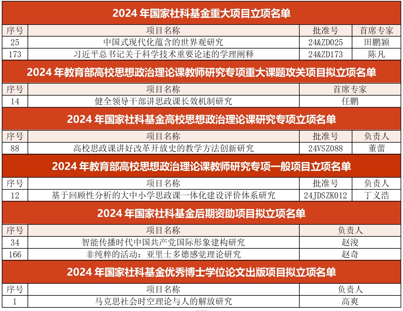 在重大项目方面,田鹏颖教授申报的《中国式现代化蕴含的世界观研究》(批准号:24&ZD025)、陈凡教授申报的《习近平总书记关于科学技术重要论述的学理阐释》(批准号:24&ZD173)获得国家社科基金重大项目立项;任鹏教授申报的《健全领导干部讲思政课长效机制研究》获得教育部高校思想政治理论课教师研究专项重大课题攻关项目拟立项。