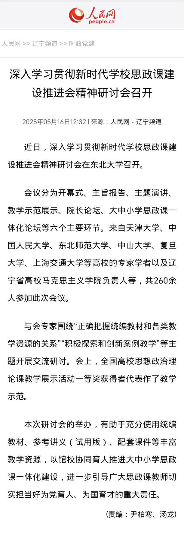 会议分为开幕式、主旨报告、主题演讲、教学示范展示、院长论坛、大中小学思政课一体化论坛等六个主要环节。来自天津大学、中国人民大学、东北师范大学、中山大学、复旦大学、上海交通大学等高校的专家学者以及辽宁省高校马克思主义二八杠 负责人等,共260余人参加此次会议。