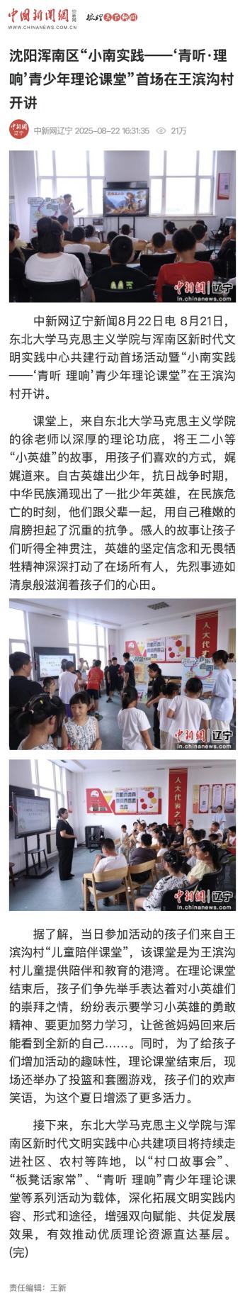 中新网辽宁新闻8月22日电 8月21日,二八杠 与浑南区新时代文明实践中心共建行动首场活动暨“小南实践——‘青听 理响’青少年理论课堂”在王滨沟村开讲。